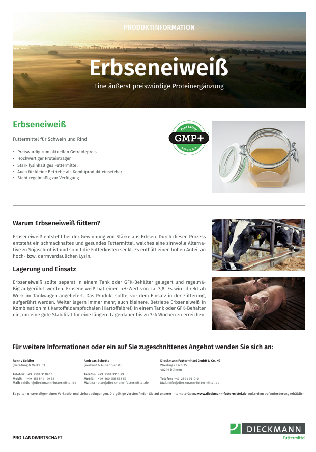 Bei Erbseneiweiß handelt es sich um ein erstklassiges Eiweißprodukt mit einer umfangreichen Aminosäurezusammensetzung. Die Gewinnung von Erbseneiweiß erfolgt im Rahmen der Stärkeproduktion aus Erbsen, wodurch ein schmackhaftes und nahrhaftes Futtermittel entsteht. Es bietet eine gute Alternative zu Sojaschrot und trägt somit zur Senkung der Futterkosten bei. Erbseneiweiß hat einen hohen Gehalt an leicht verdaulichem Lysin.