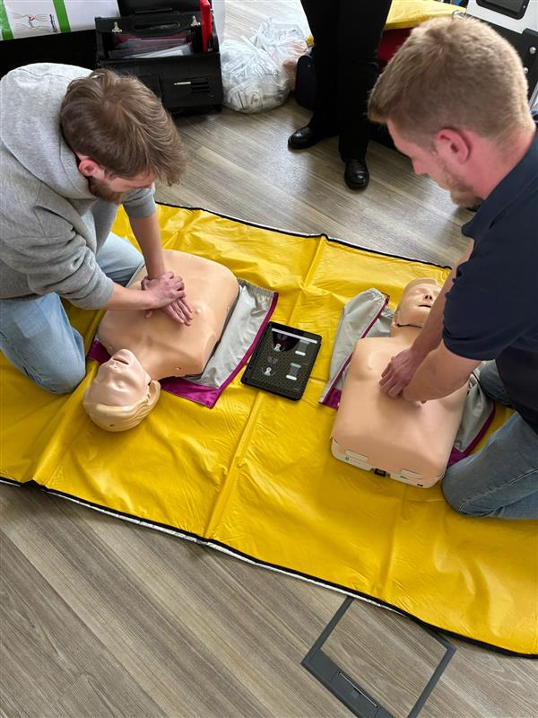 Auf dem Programm standen sowohl theoretische Grundlagen als auch praktische Übungen. Zunächst ging es um zentrale Fragen: Wie erkenne ich eine Notfallsituation? Welche Maßnahmen sind als Erstes zu ergreifen? Im anschließenden Praxisteil konnten die Teilnehmenden das Gelernte direkt anwenden und unter Anleitung verschiedene Szenarien trainieren – darunter auch die stabile Seitenlage oder Wiederbelebungsmaßnahmen.